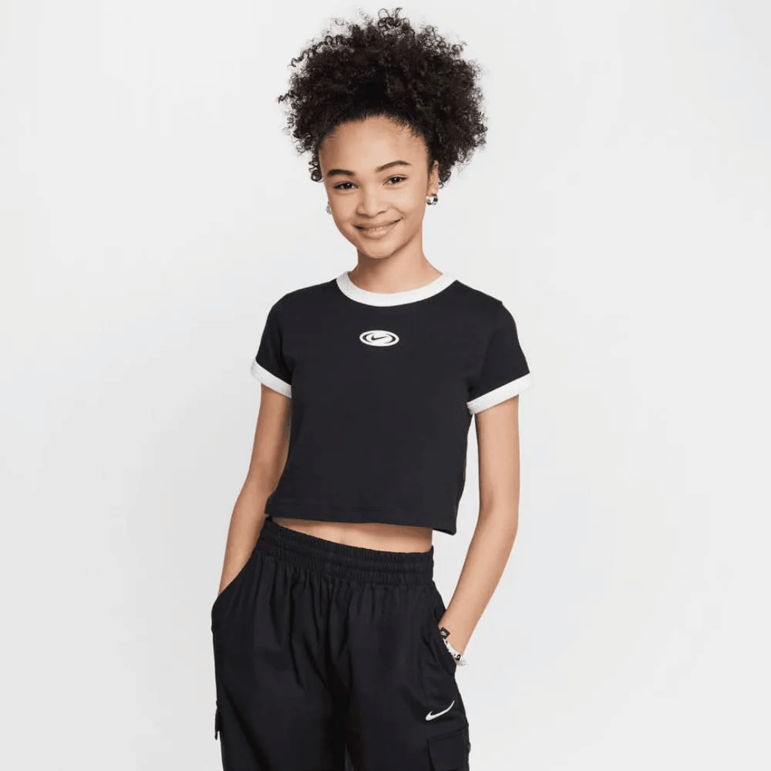 La Nike T-Shirt Cropped Basic Black Kids es la prenda perfecta para un look moderno y deportivo en los más jóvenes. Su corte corto y diseño minimalista aportan un estilo fresco y actual, ideal para combinar con shorts, joggers o calzas. Confeccionada en algodón suave y ligero, brinda comodidad durante todo el día, mientras su color negro clásico la hace versátil y fácil de adaptar a cualquier outfit. Diseñada para resistir el uso diario sin perder forma ni confort, es la elección ideal para niñas que buscan una remera práctica, cómoda y con toda la esencia Nike.