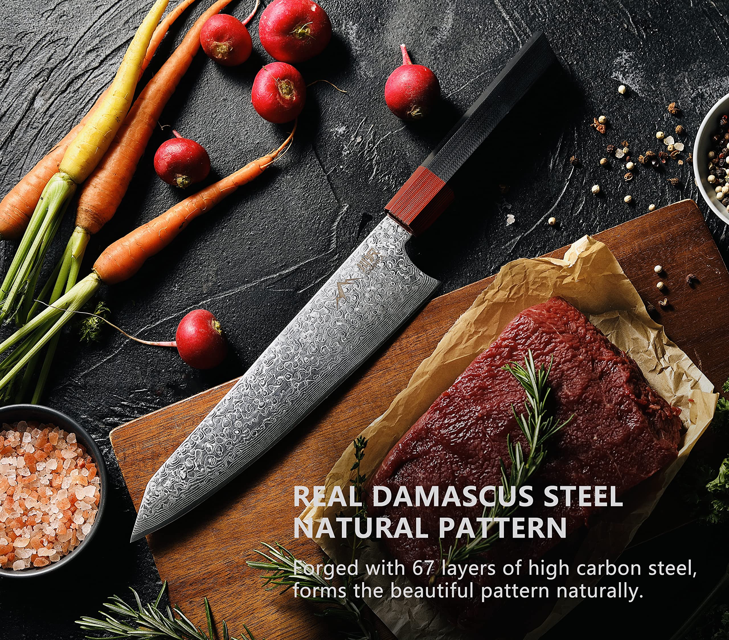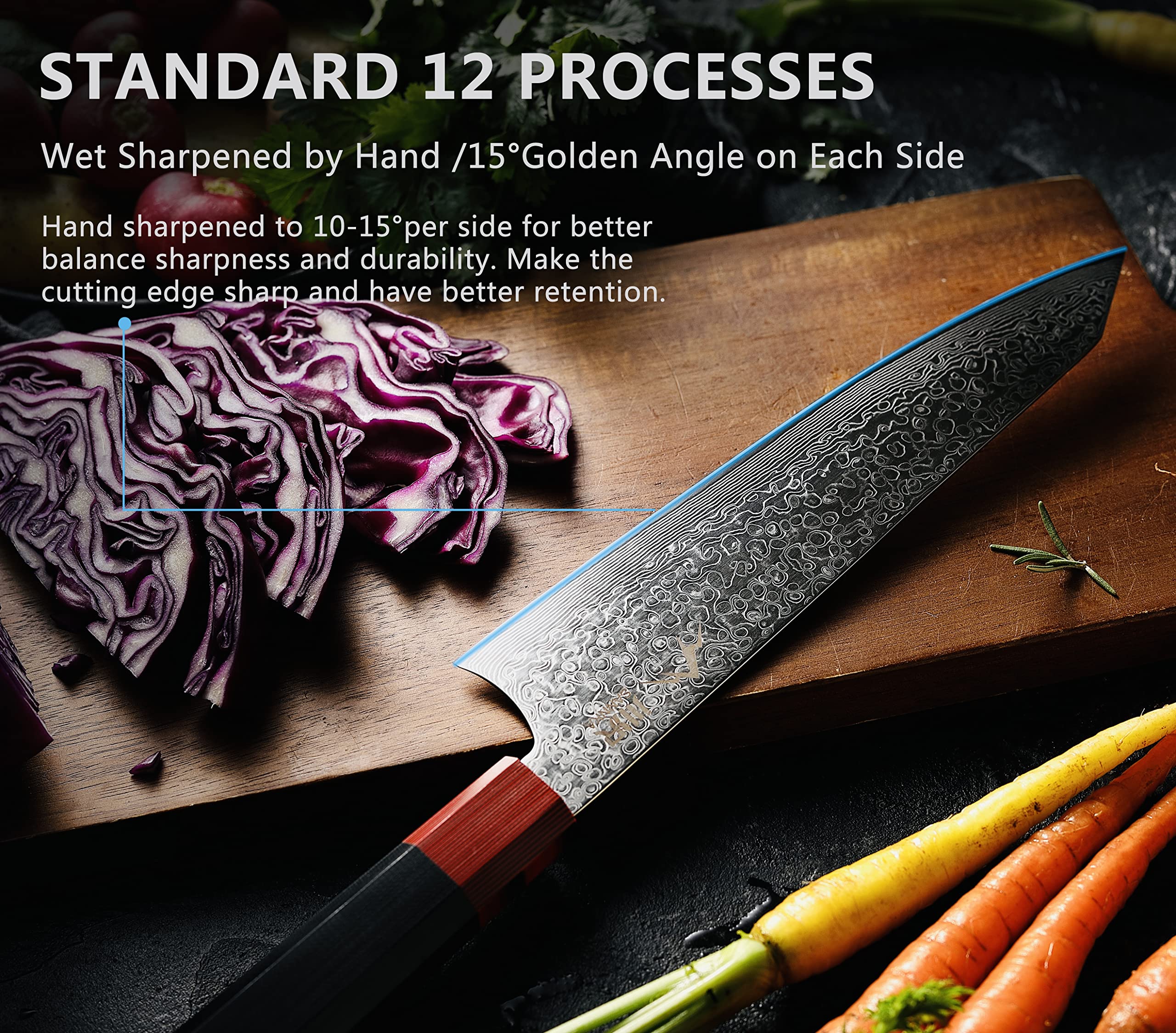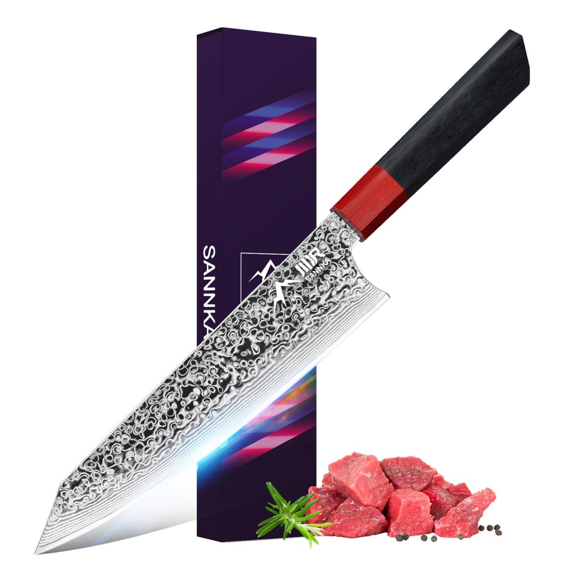 🔪 Sannka Kiritsuke en Acero Japonés VG-10 en Damasco, con un elegante patrón damasquino en la hoja de 20 cm.
