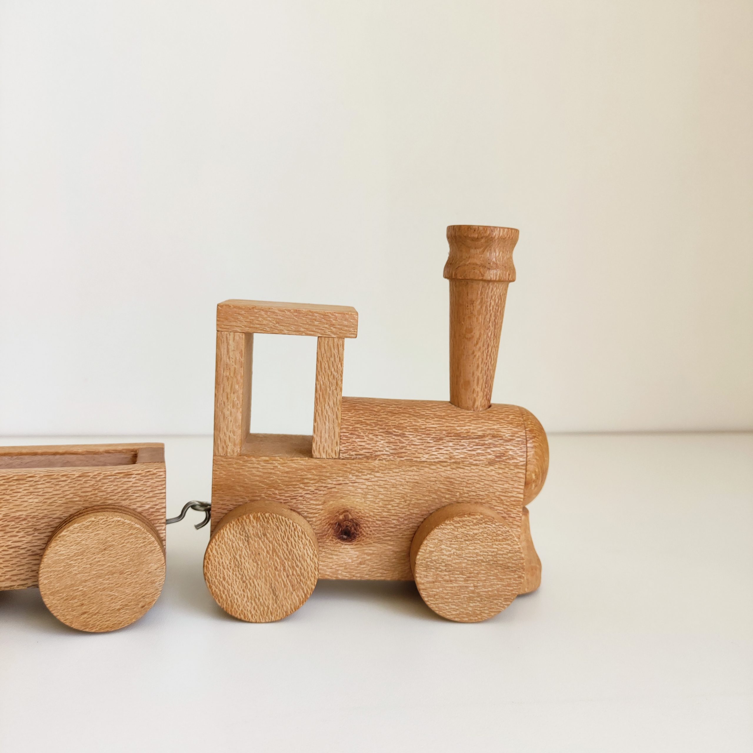 Un pequeño tren de madera que invita a imaginar caminos nuevos, siempre cerca de la naturaleza.