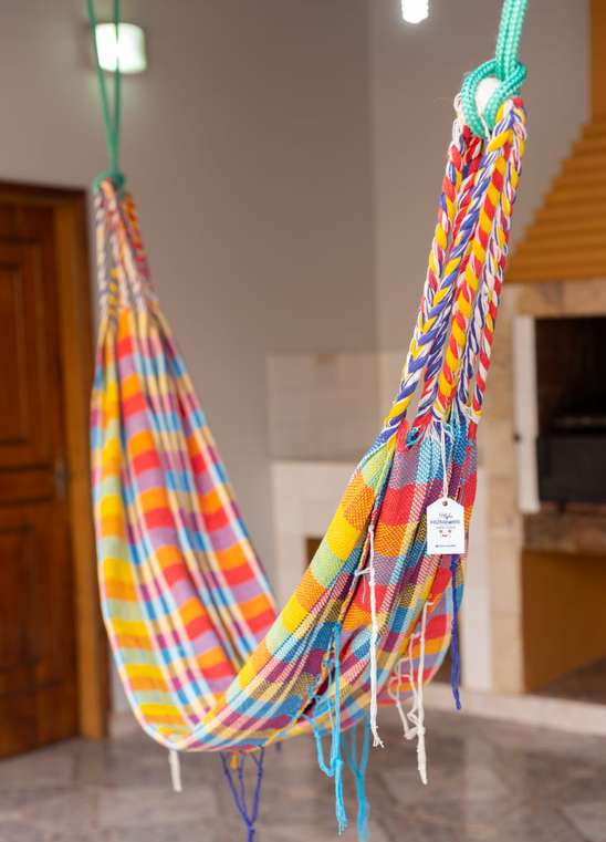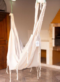 Caja de cartón reciclado rectangular con sidra La Preferida o similar, hamaca paraguaya colorida con logo bordado, vino Alma Mora Cabernet, chocolate Alpino, Miel Negra 250 ml, galletitas danesas, turrón navideño, budín Bauducco 200 g, moño y tarjeta alusiva. Ideal para regalos empresariales exclusivos.