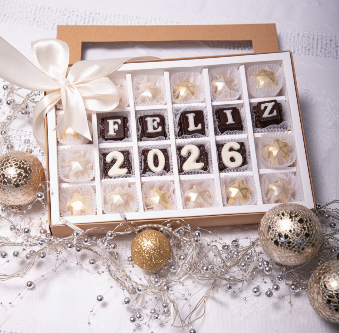 Caja temática “Feliz 2026” con bombones surtidos decorados en tonos navideños. Perfecta para recibir el nuevo año con dulzura.Peso aproximado total: 288 g