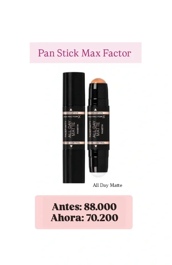 Base en Barra Max Factor que contiene en un extremo la base y en el otro extremo la barra que elimina el brillo y la grasitud del rostro dejándolo con un aspecto Matte todo el día.