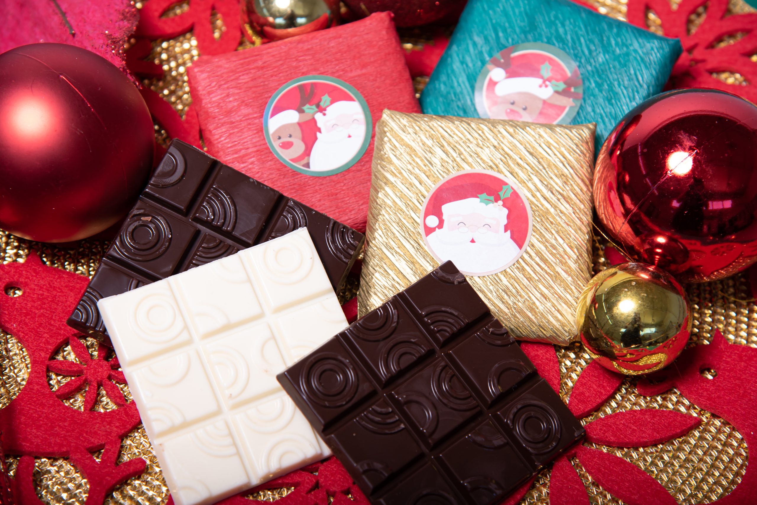 Tabletas de chocolate artesanal con diseño navideño, elaboradas con chocolate de alta calidad. Disponibles en chocolate blanco, con leche o semiamargo según stock.